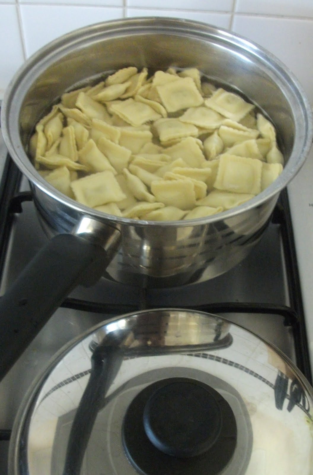 While that is on, I boil the Tortellini or Ravioli; which you buy pre packaged in the fridge section of your supermarket, for 5 mins...